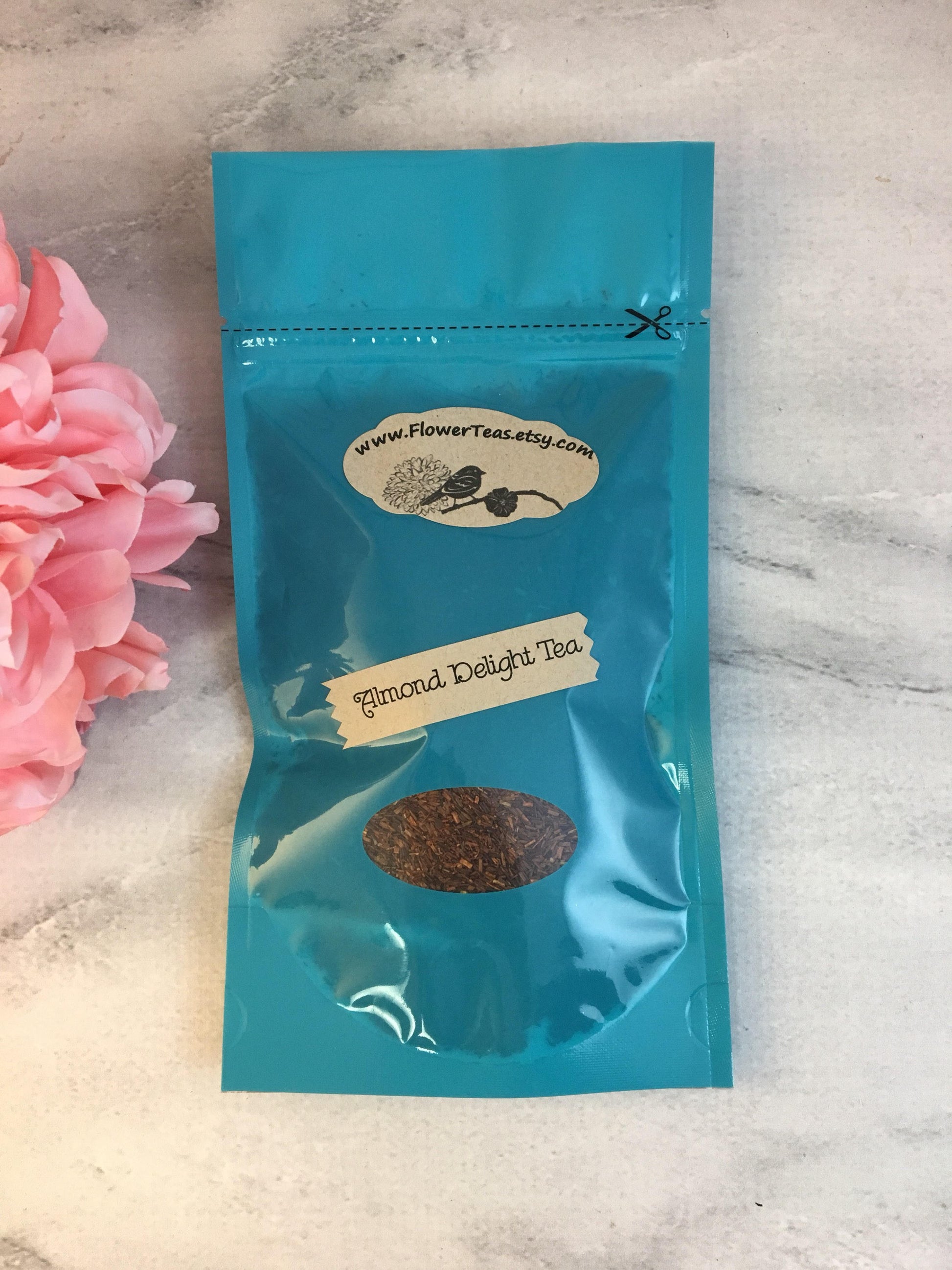 Almond Delight Tea is a loose leaf, naturally decaffeinated herbal blend, available in a pouch or tin. Vanilla and almond blended for a decaffeinated sweet treat with fewer calories than the real thing! Ingredients: Rooibos, Almonds, Calendula, Cornflower Petals, Vanilla, Almond Oil Caffeine- None Non GMO Fair Trade Compliant Sustainably Sourced Gluten Free This package will yield approximately 30 cups of brewed tea and can be infused more than once for additional enjoyment! PREPARATION: Place 1 heaping teaspoon of loose leaf tea per 6 oz of hot to boiling water into an infuser or filter. Allow tea to steep for 3 to 5 minutes, remove infuser/filter with leaves and enjoy.