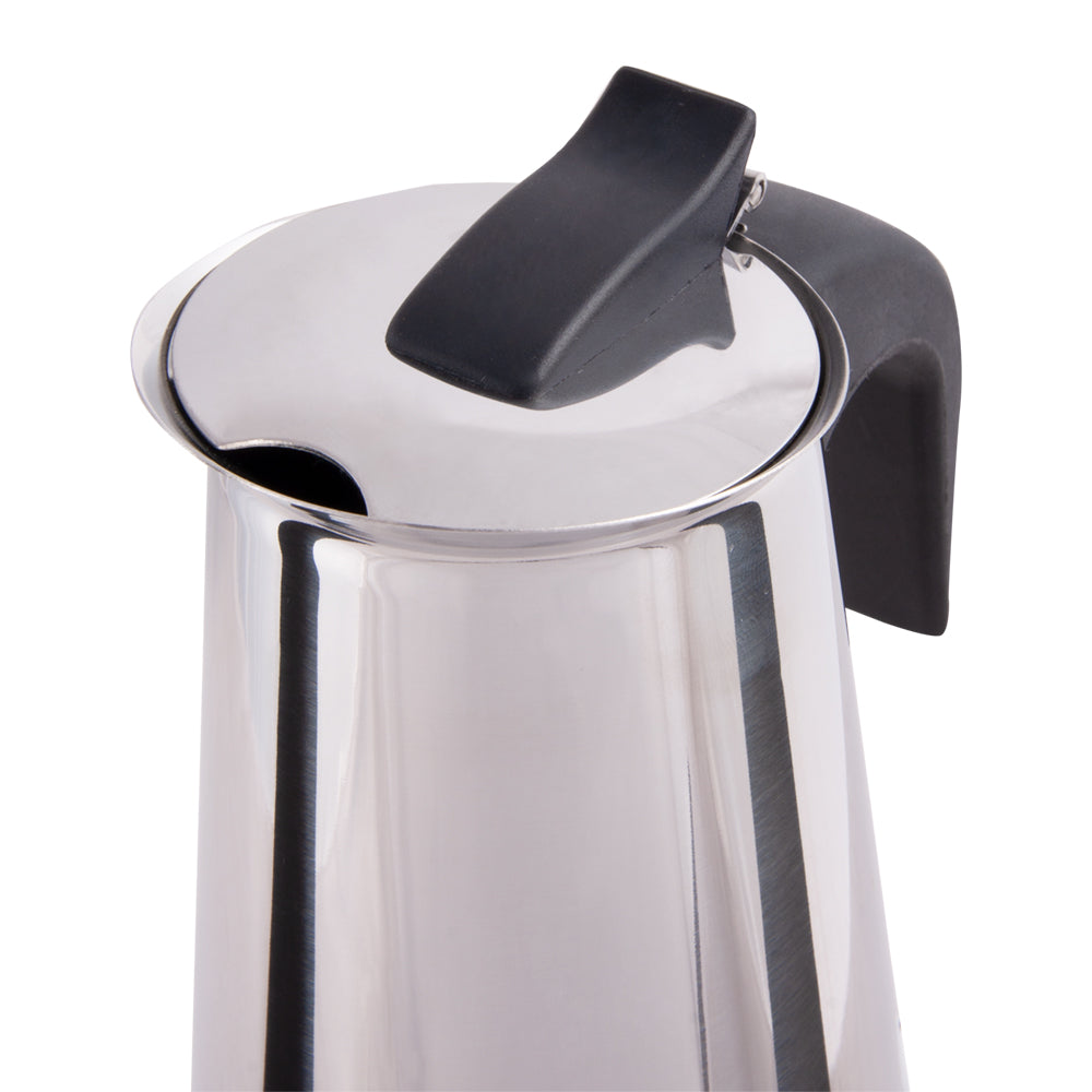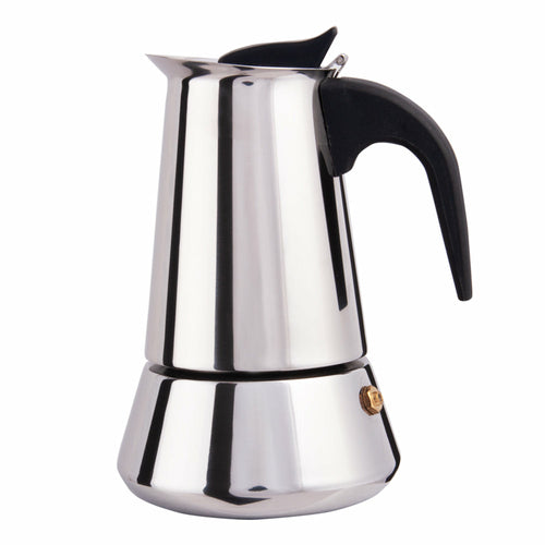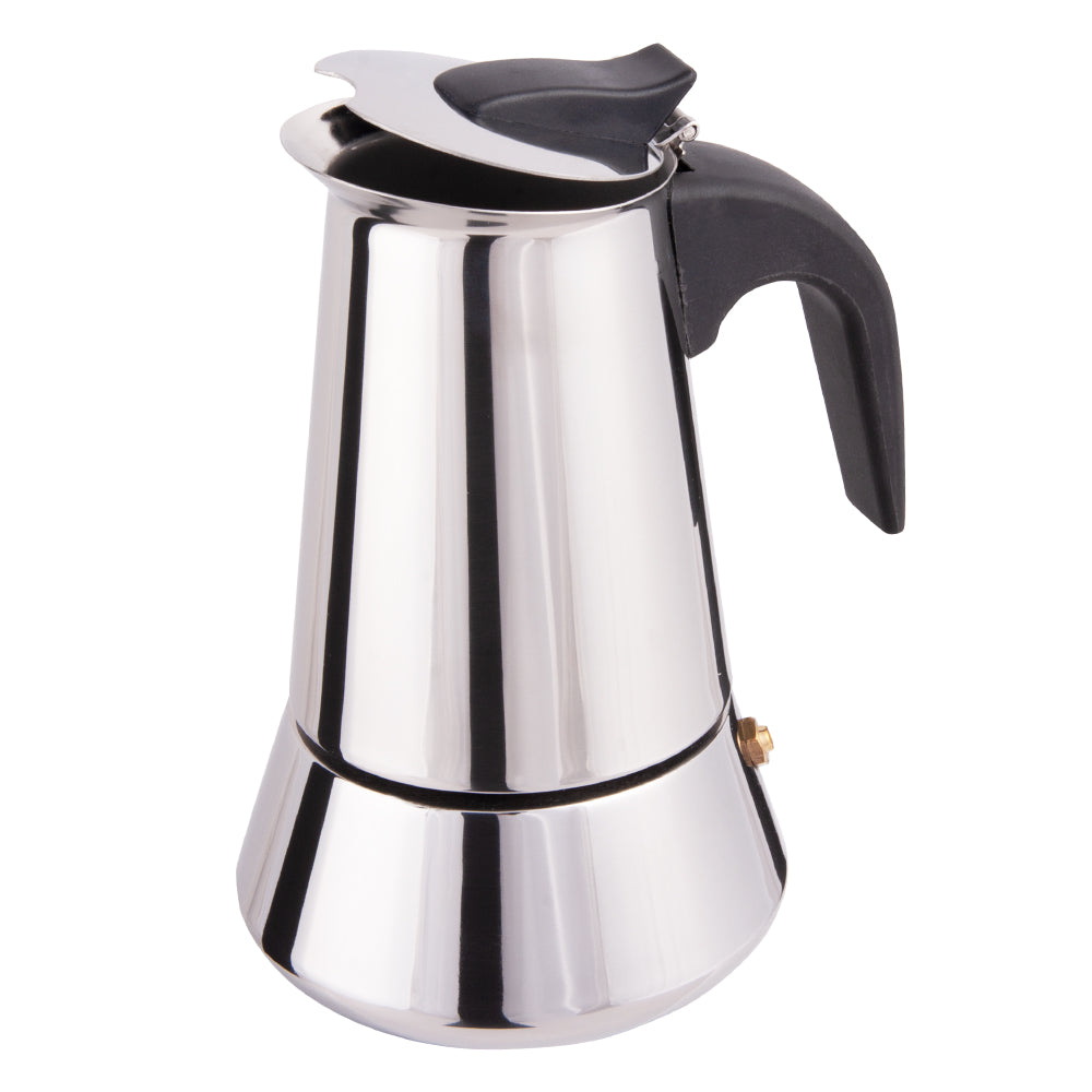 This model is compatible with gas stoves as well as electric and induction cooktops. The handle is heat-resistant, and there's a safety-valve and an easy-pour spout to prevent spills. The handle on the Moka Express is simple and elegant. It ensures security and optimal grip.