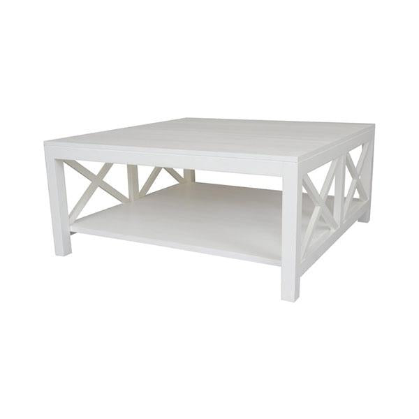This satin finished white coffee table with its "Cross" features will give your room that Hamptons Look. Made of Bayur Wood/ MDF & painted White.
