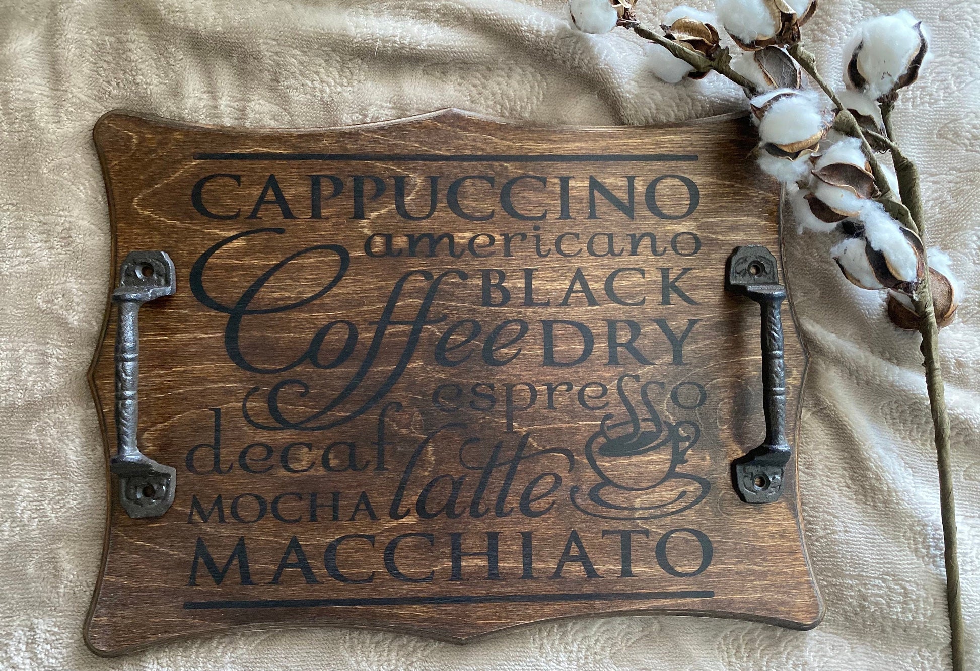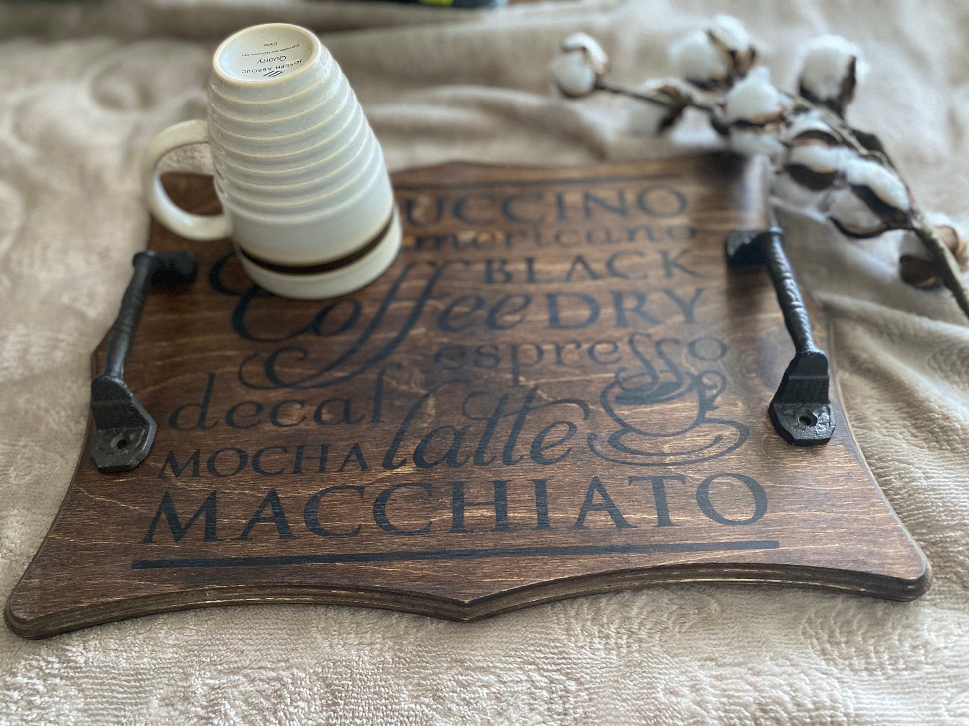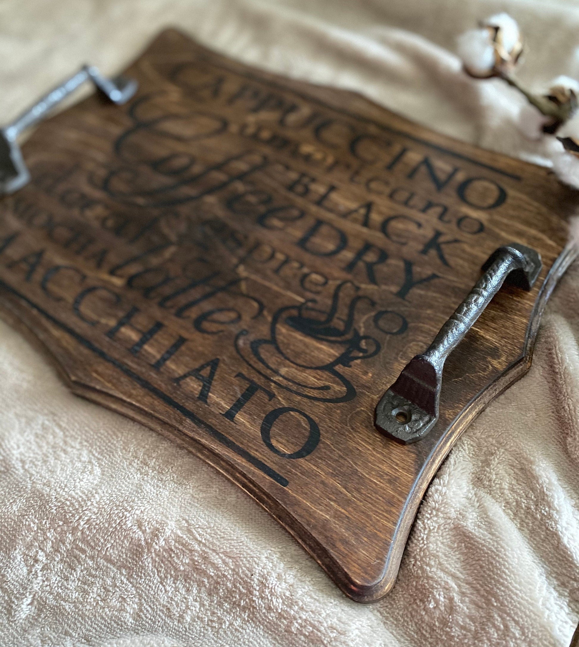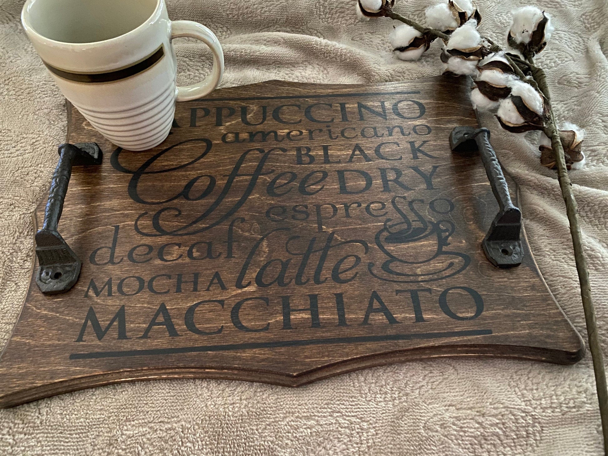 This handmade wooden serving tray makes a great addition to your kitchen, coffee bar or farmhouse decor. The tray is made of maple plywood and stained in a rich chestnut color. The design features all your favorite coffee drinks and is burned into the wood. This technique makes the image permanent and it will never fade, chip or peel.