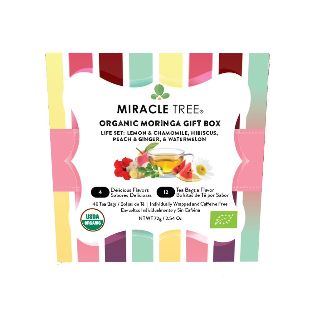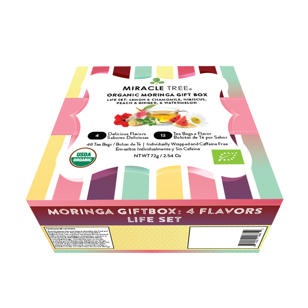 Miracle Tree's Organic Moringa Superfood Tea range are award-winning herbal infusions in a beautifully crafted tea box! Enjoy 48 individually wrapped tea bags in 4 different flavors (12 each)! Enjoy 12 bags each of Lemon Chamomile, Ginger Peach, Watermelon, and Hibiscus. Miracle Tree's Moringa Teas are an excellent idea as a gift for any occasion.