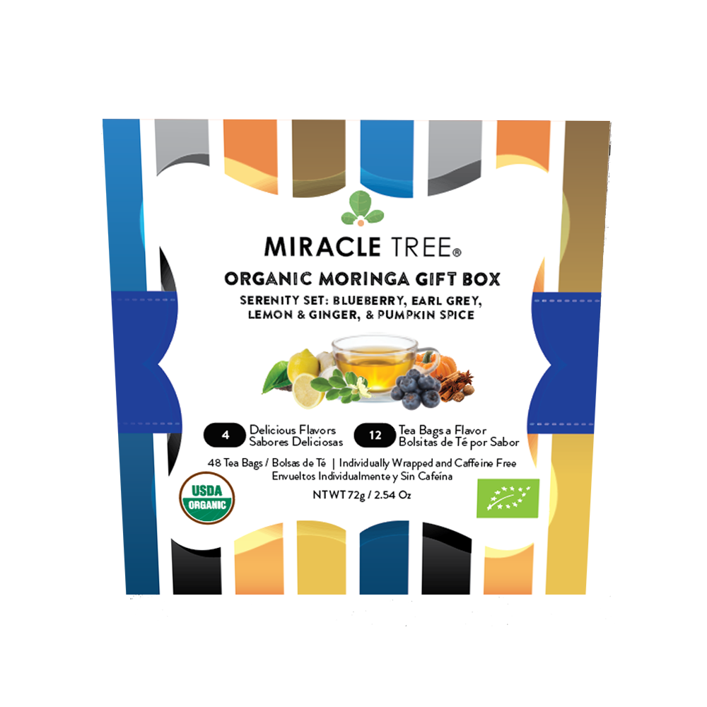 Miracle Tree's Organic Moringa Superfood Tea range are award-winning herbal infusions in a beautifully crafted tea box! Enjoy 48 individually wrapped tea bags in 4 different flavors (12 each)! Enjoy 12 bags each of Blueberry, Earl Grey, Lemon Ginger, and Pumpkin Spice. Miracle Tree's Moringa Teas are an excellent idea as a gift for any occasion.