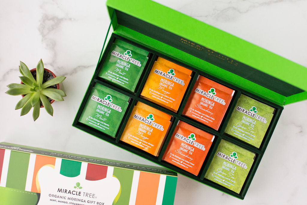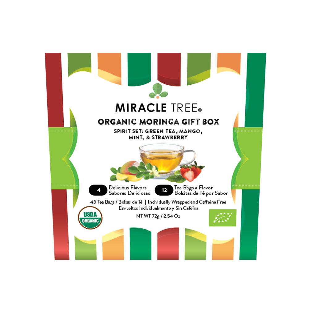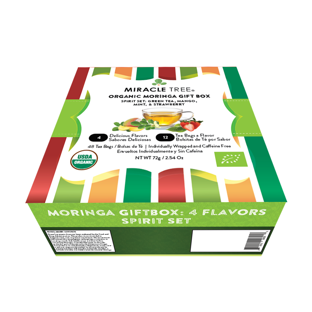 Miracle Tree's Organic Moringa Superfood Tea range are award-winning herbal infusions in a beautifully crafted tea box! Enjoy 48 individually wrapped tea bags in 4 different flavors (12 each)! Enjoy 12 bags each of Mint, Mango, Strawberry, Green Tea. Miracle Tree's Moringa Teas are an excellent idea as a gift for any occasion.