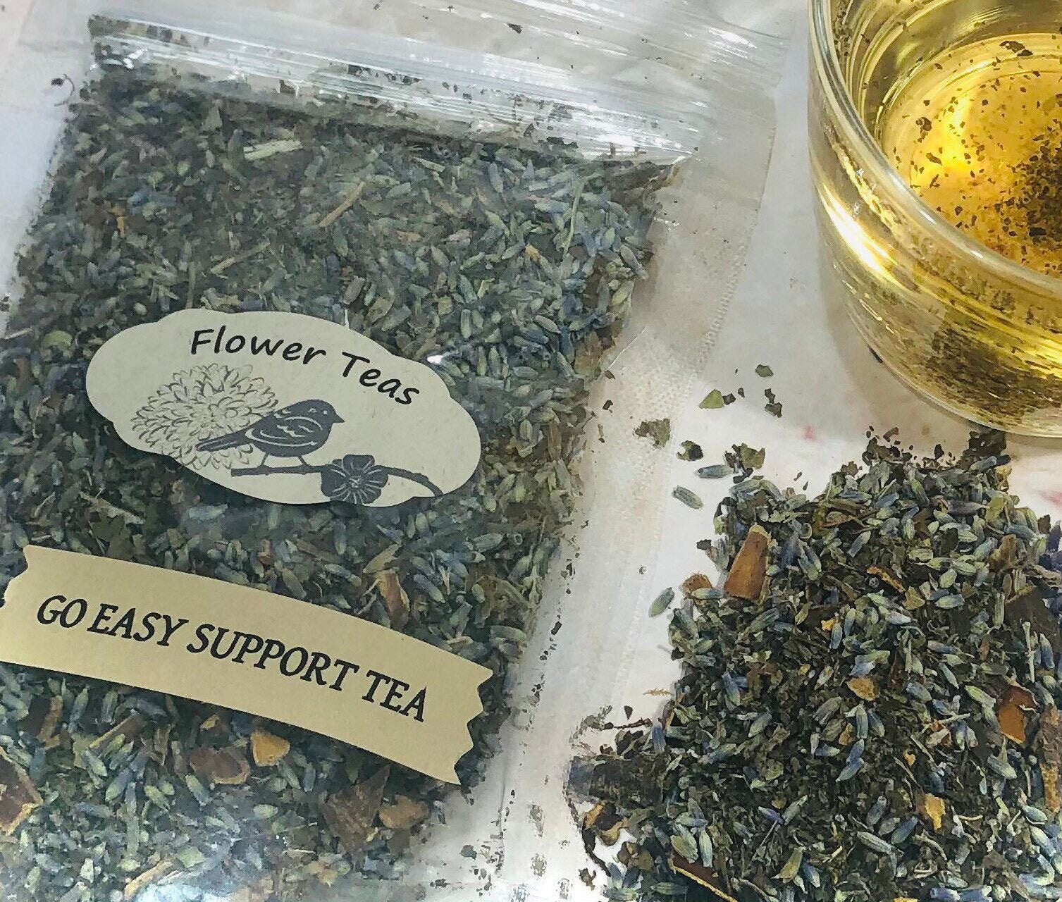 Go Easy Support At the Farmer's Market I keep this tea with the wellness varieties. These ingredients are known for their relaxation of the colon and spirit and they provide a wonderful aroma and gentle relaxing taste to the tea drinking experience. Caffeine? None! One ounce yields approximately 20 cups of tea. All Teas are Non-GMO, Sustainably Sourced, Fair Trade Compliant and Gluten Free. The ingredients and expiration date is clearly marked on the sealed packaging with steeping information included.
