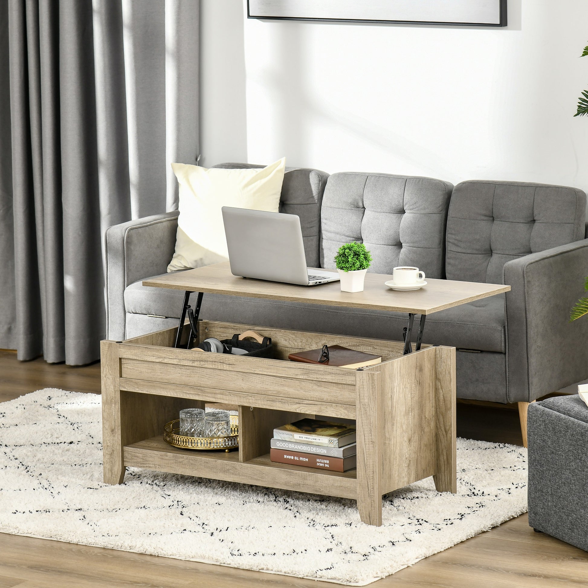 HOMCOM Lift Top Coffee Table with Hidden Storage Compartment and Open Shelves, Lift Tabletop Pop-Up Center Table for Living Room, Oak Effect