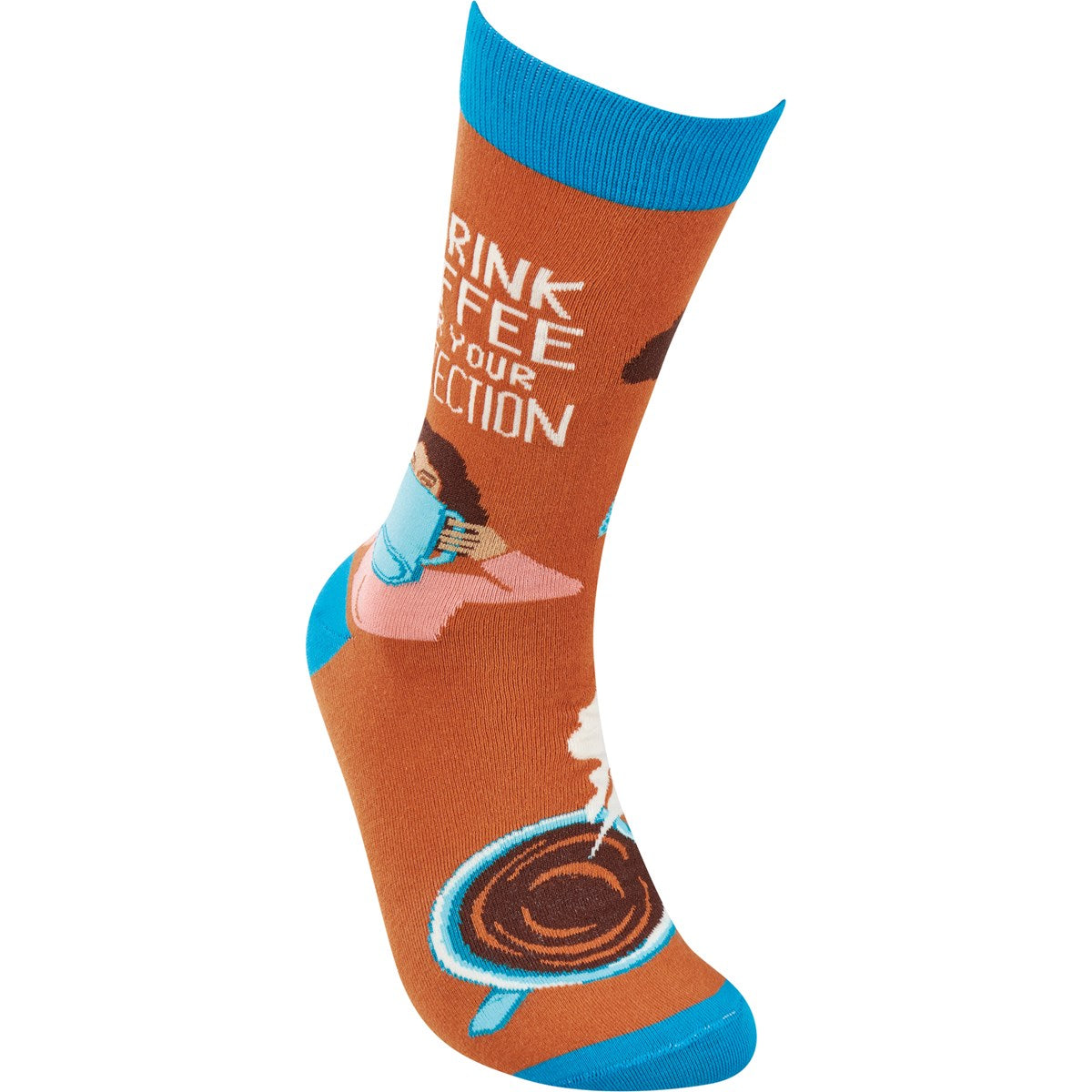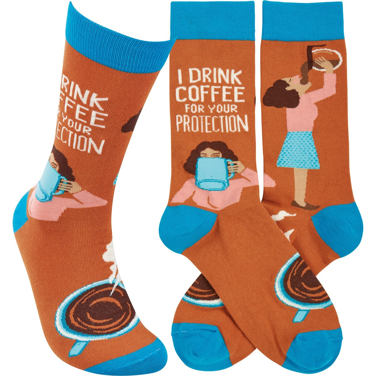 A pair of colorful woven socks displaying hand illustrated designs of a person drinking coffee with "I Drink Coffee For Your Protection" sentiment. Socks feature a one size fits most design made with cotton, nylon, and spandex.