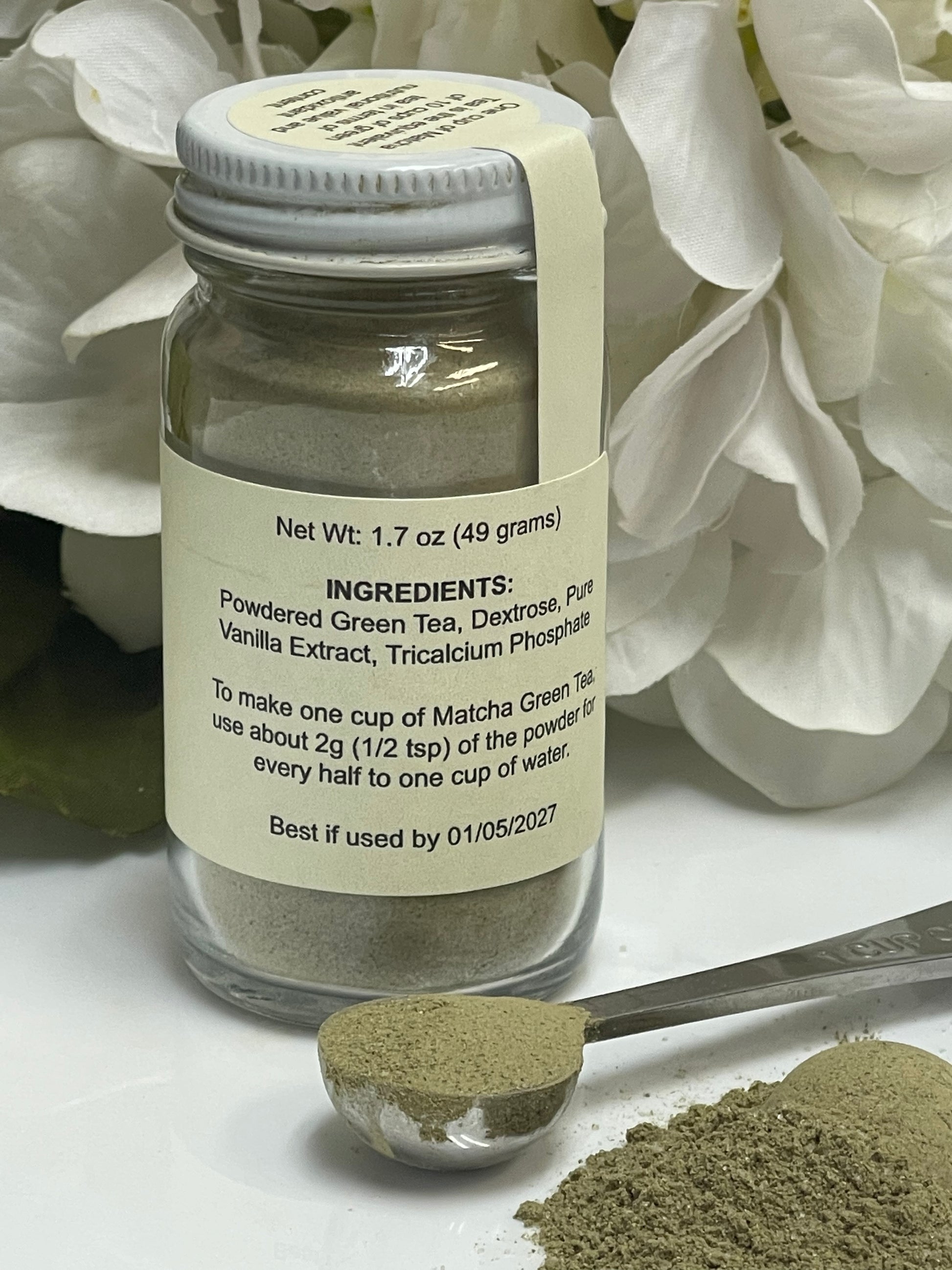 Ingredients: Stone Ground Kyoto Green Tea and Vanilla Powders Caffeine- Yes, some, green tea is a naturally caffeinated botanical. It grows out of the ground that way! One cup of this tea has about 1/2 the caffeine a same size cup of coffee has but the antioxidants greatly increase the bioavailability to your system.