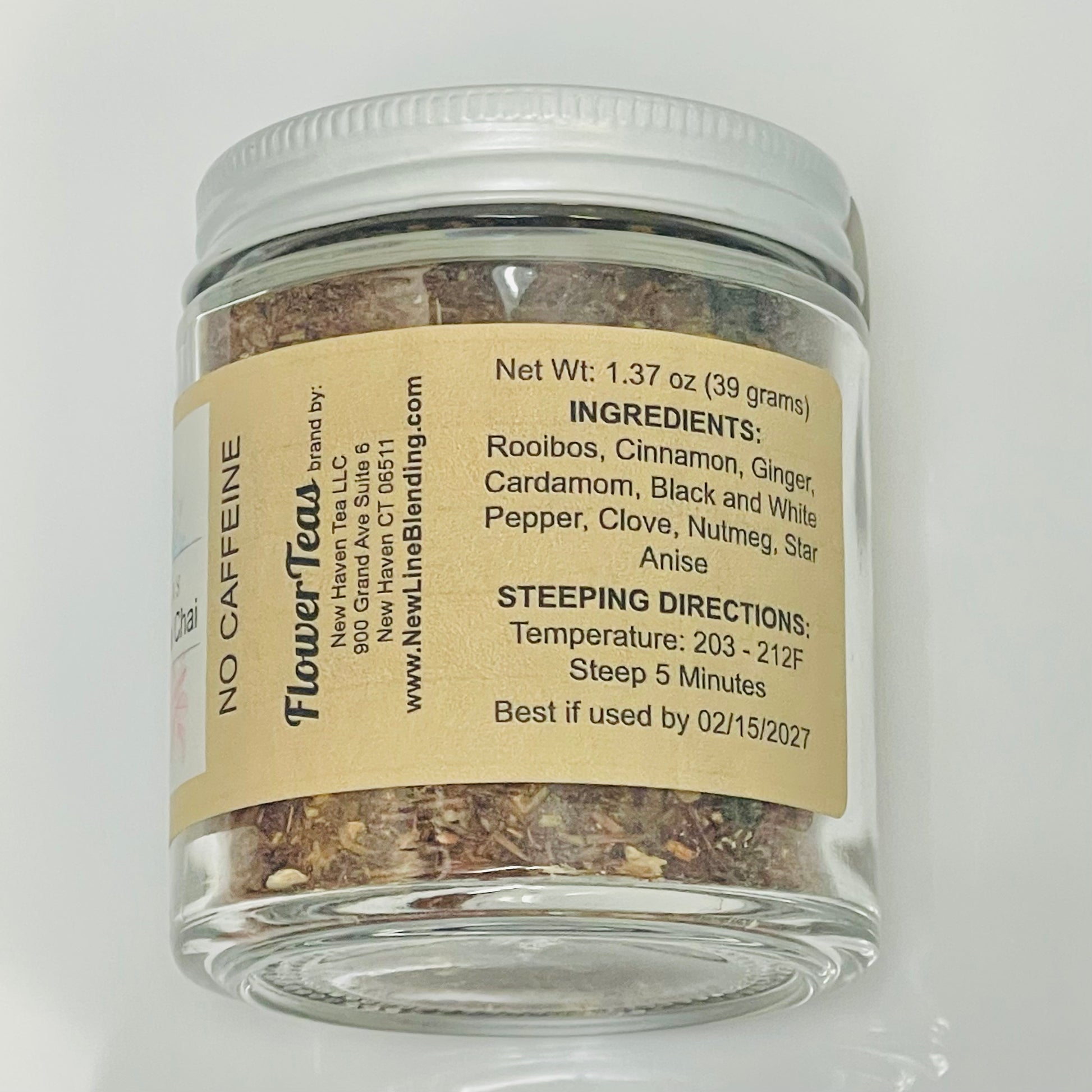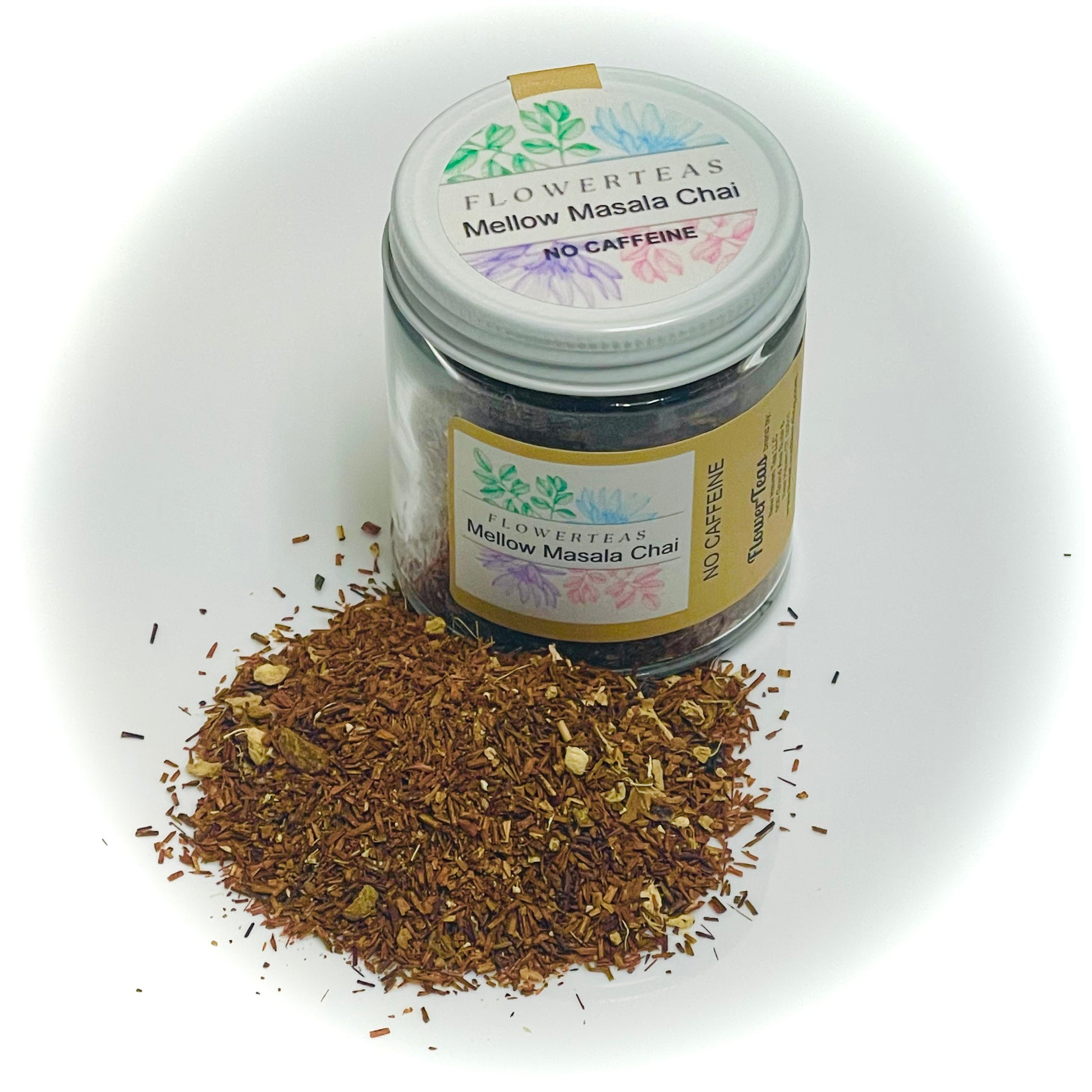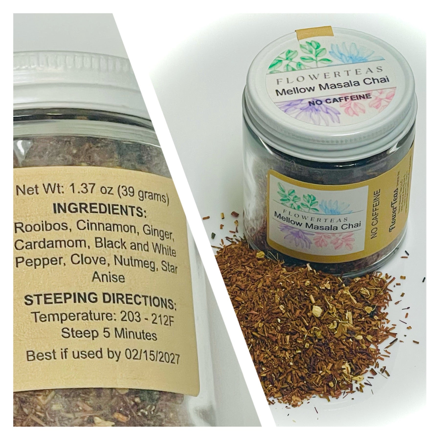 Mellow Masala Chai Herbal Loose Leaf Tea Masala chai is traditionally made with a black tea base, here we've blended rooibos leaves with the aromatic spices you know and love. Try mixing it with the steamed milk of your choice to make a delicious decaf chai latte. Ingredients - African Rooibos Leaf, cinnamon, cardamom, nutmeg, ginger root, white and back pepper, anise Caffeine - None Non GMO Sustainably Sourced Fair Trade Compliant Gluten Free PREPARATION: Place 1 heaping teaspoon of loose leaf tea per 6 oz of hot to boiling water into an infuser or filter. Allow tea to steep for 3 to 5 minutes, remove infuser/filter with leaves and enjoy!