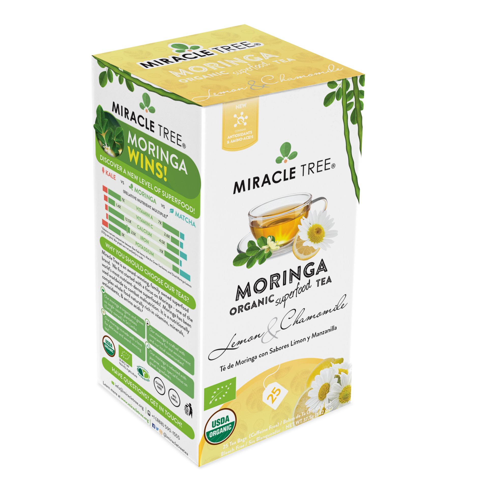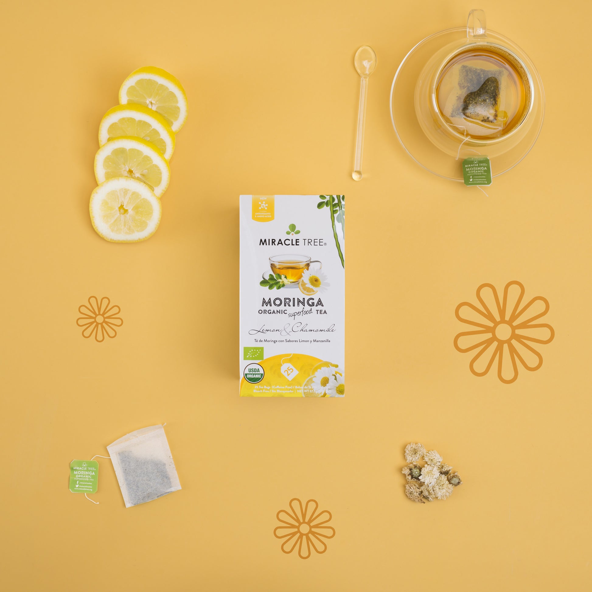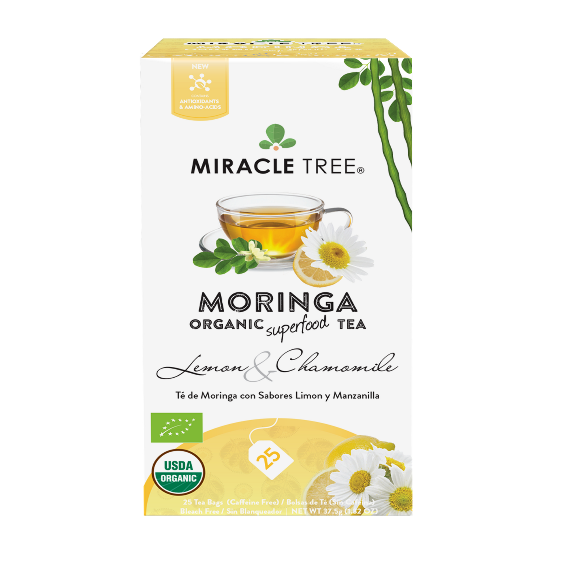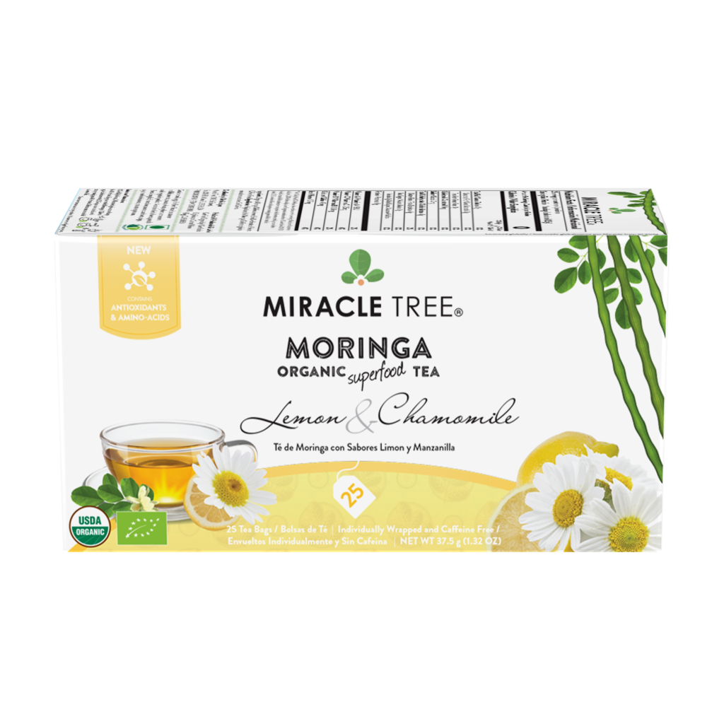 25 WRAPPED TEA BAGS, ORGANIC MORINGA LEAF, NON-GMO, CAFFEINE-FREE, & ABSOLUTELY DELICIOUS. ORGANIC MORINGA TEA, LEMON & CHAMOMILE: Miracle Tree's Lemon & Chamomile Organic Moringa Superfood Tea pleasingly combines the fresh flavors of citrusy lemon with calming chamomile petals, and the superfood qualities of Moringa.