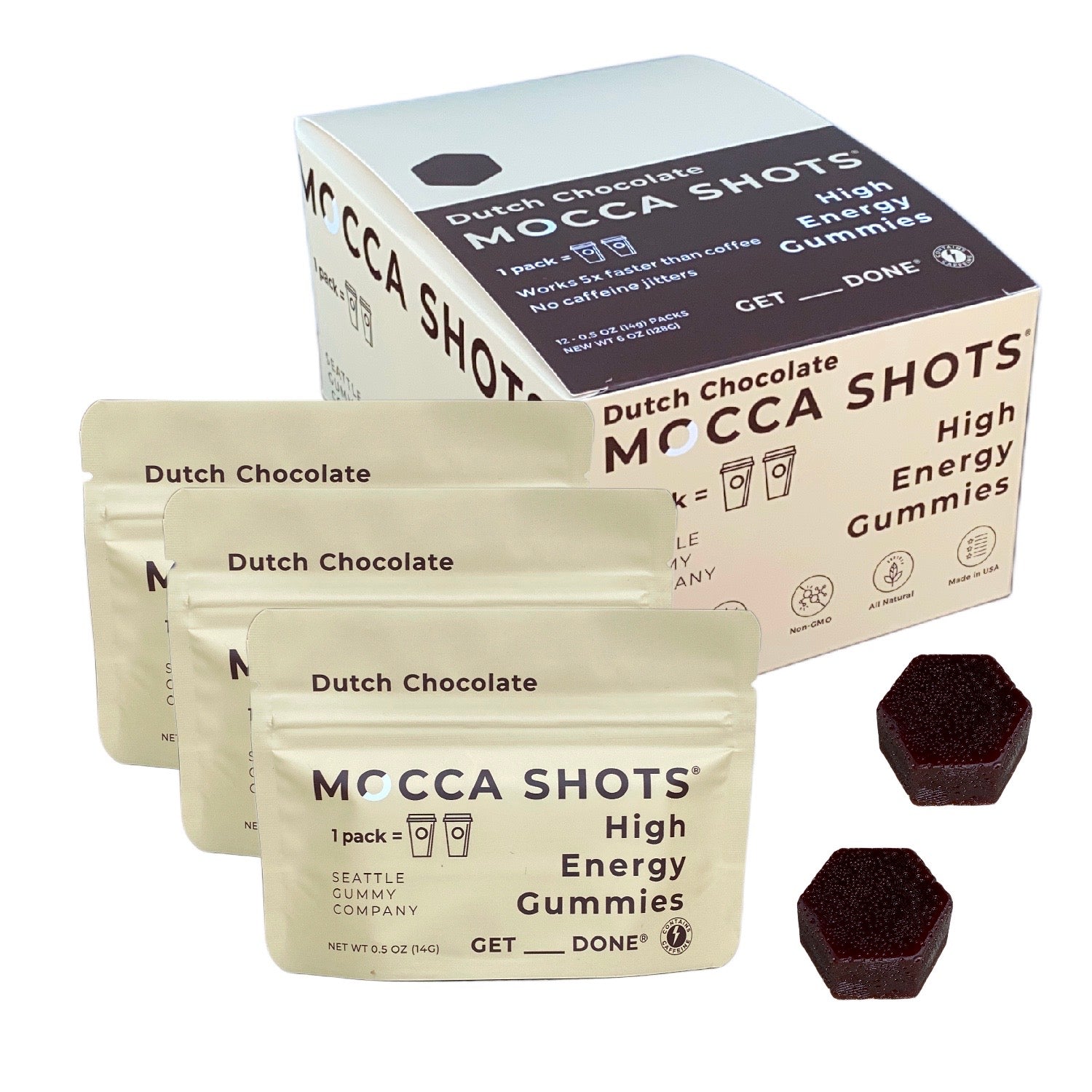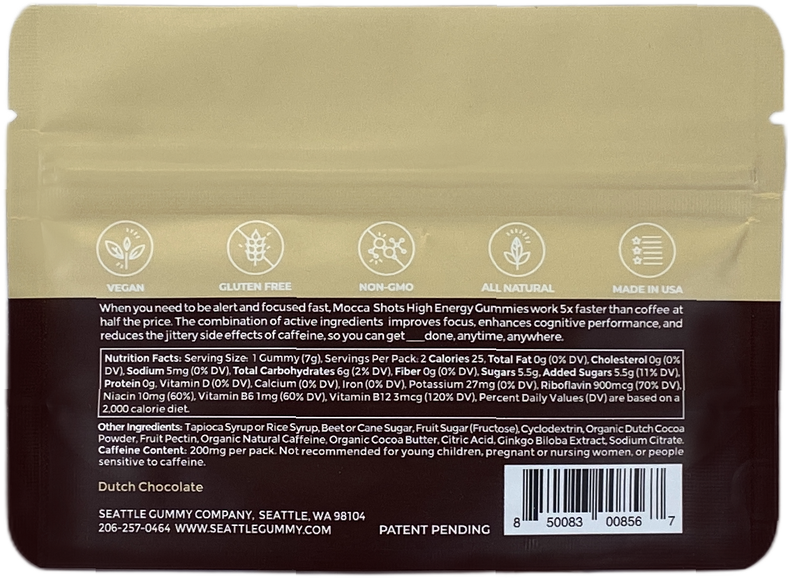Mocca Shots High Energy Gummies work 5x faster than coffee at half the price. A unique combination of caffeine, vitamin Bs, and herbal nootropics helps boost energy, improve focus, and enhance cognitive performance without jittery side effects, so you can GET____DONE, anytime, anywhere.