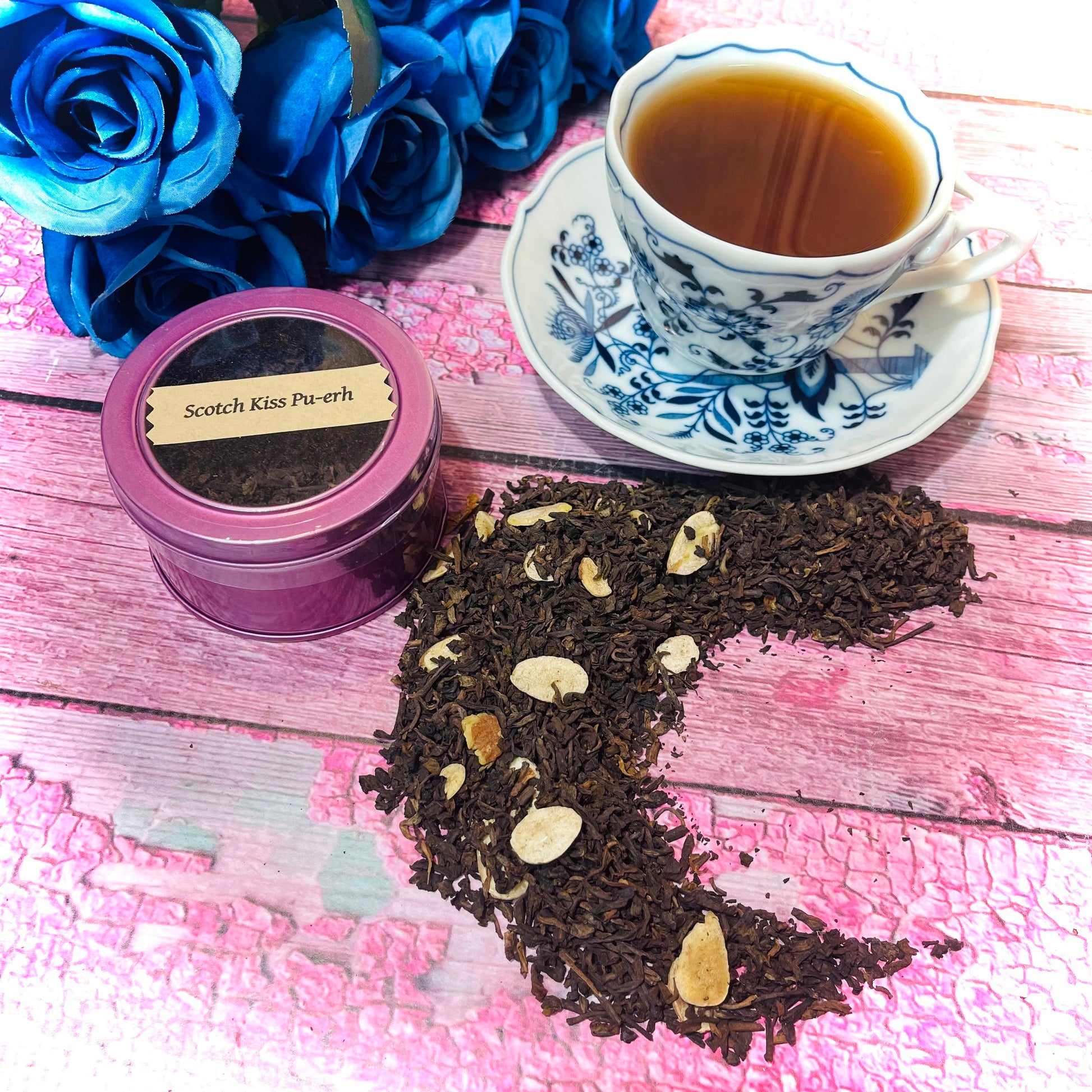 Scotch Kiss Pu-erh Loose Leaf Tea is available in a 1 oz Tin Pu-erh is an aged and fermented variety of tea from the Yunnan province in China. This blend is fashioned from a loose style of black leaf pu-erh. Caramel flavored, with the addition of almonds, it tastes like a candy bar in a cup. Ingredients - Aged and fermented black tea leaves, Almonds, Natural Caramel Flavoring Caffeine? Yes, it grows out of the ground that way! CONTAINS NUTS Non GMO Fair Trade Compliant Sustainably Sourced Gluten Free 1 oz of loose leaf tea translates into approximately 15 cups depending on the strength desired. PREPARATION: Place 1 heaping teaspoon of loose leaf tea per 6 oz of hot to boiling water into an infuser or filter. Allow tea to steep for 3 to 5 minutes, remove infuser/filter with leaves and enjoy.