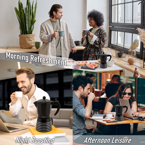 - 【SAFE USE & EASY TO CLEAN】: The 3 cup moka pot applies premium food grade aluminum without risk of rust, scale or metal flakes from inferior stainless pots. Imported italy safe valve effectively regulates the air pressure and prevents the spilling. Rinse the stovetop coffee maker after usage, fully air and dry it. (no washing liquid needed & dishwasher banned).