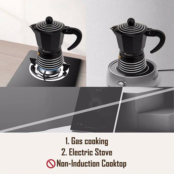 - 【BREWING & WARNING】: The delicate stove top coffee maker could be heated on gas stove/alcohol/camp/ceramic/electric furnace under medium fire within 5 minutes. please do not use induction cooker or brewing under fierce flames might burn the handle and destroy the flavor.